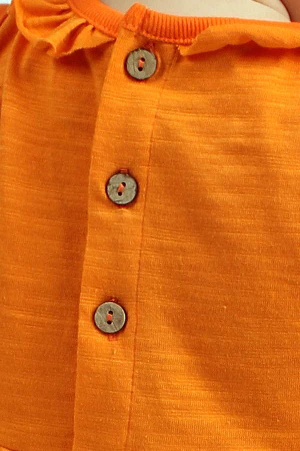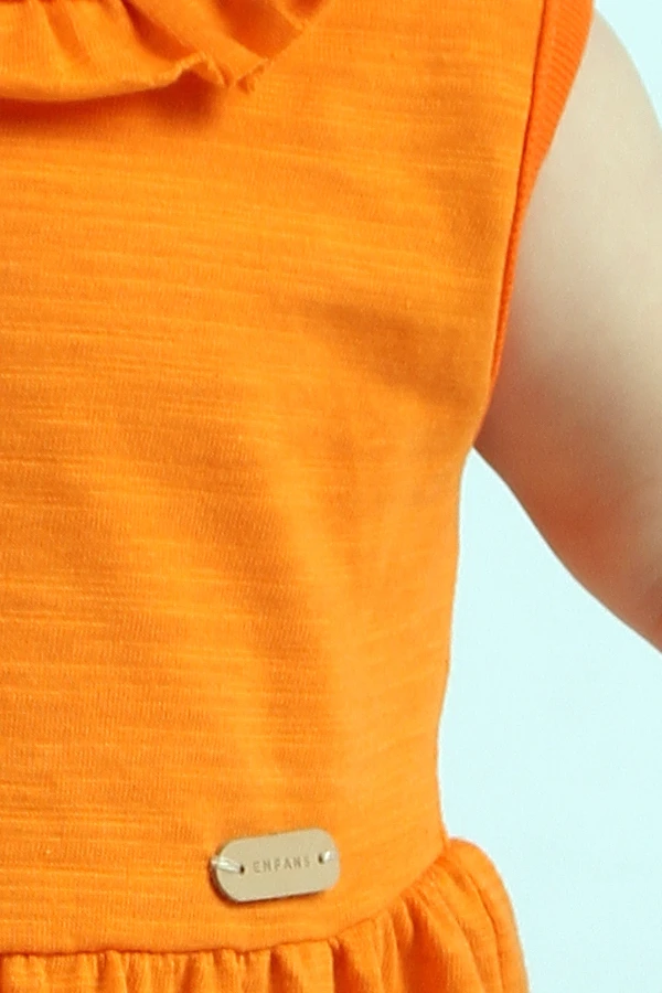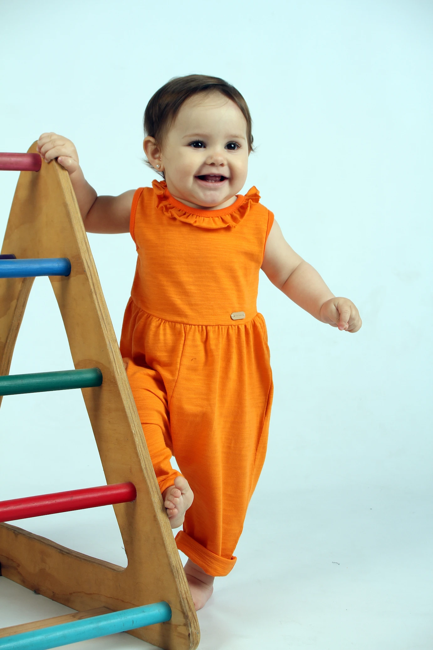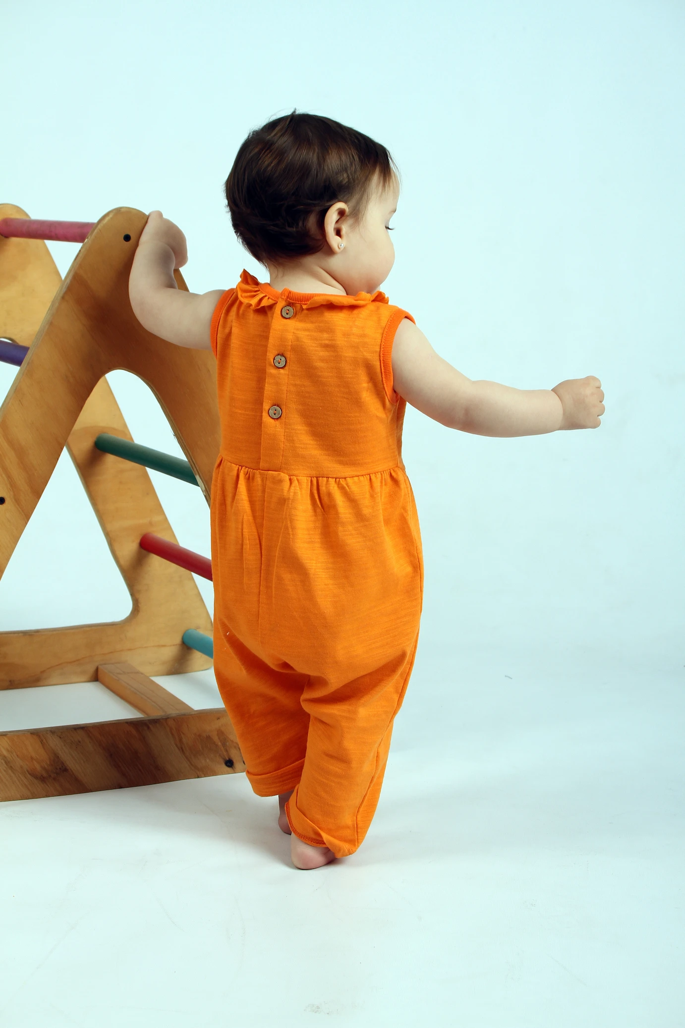 Este enterito musculosa de tela Flame 100% algodón es una prenda cómoda y fresca. Tiene un cuello redondo con voladitos que combinan con la tela. En la parte trasera, cuenta con una cartera con botones de coco para un cierre fácil.
