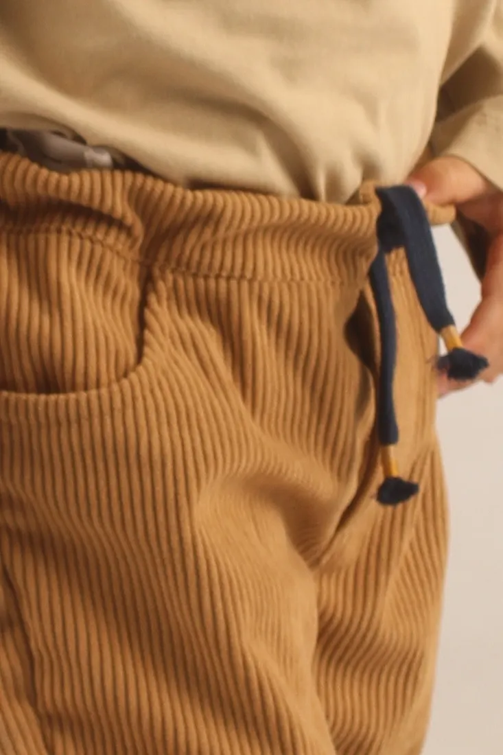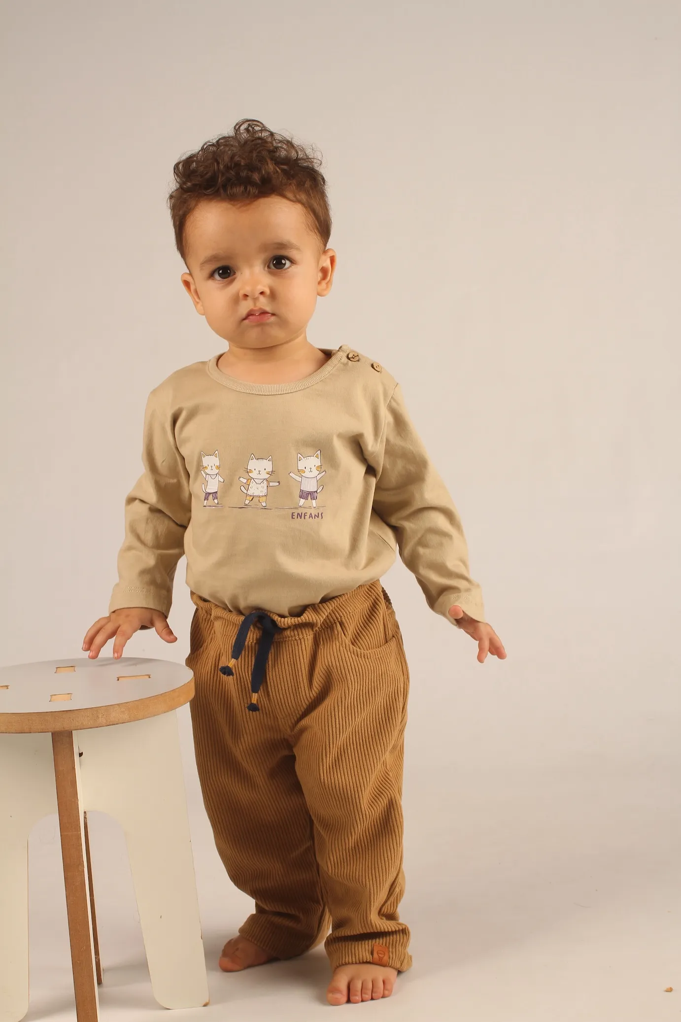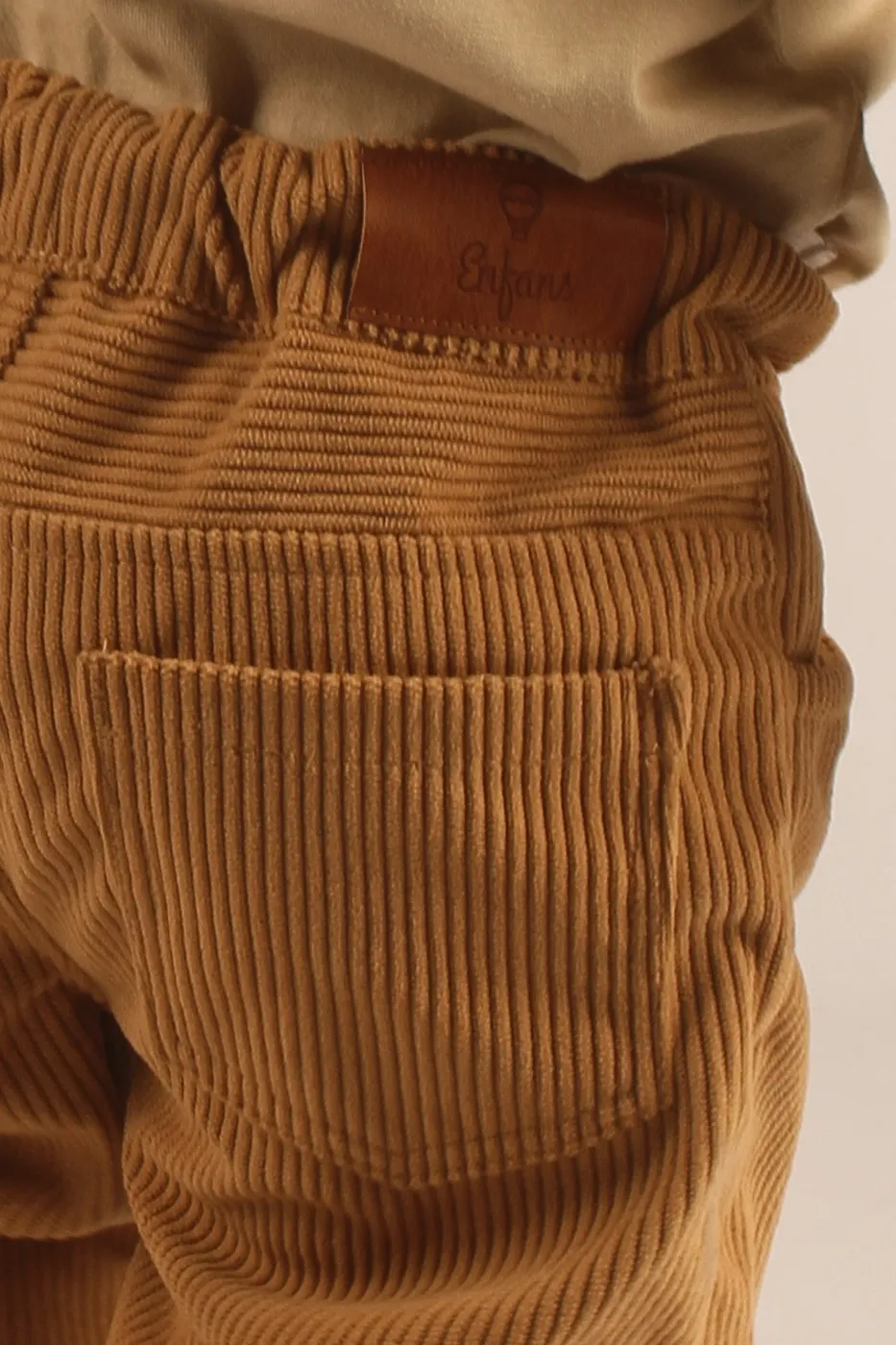 El pantalón Canelo está confeccionado en corderoy, con bolsillitos redondos y un cordón ajustable a contra tono para un ajuste cómodo. Su bolsillito plaqué trasero y el detalle de cuerito Enfans en el ruedo le dan un toque especial y único.