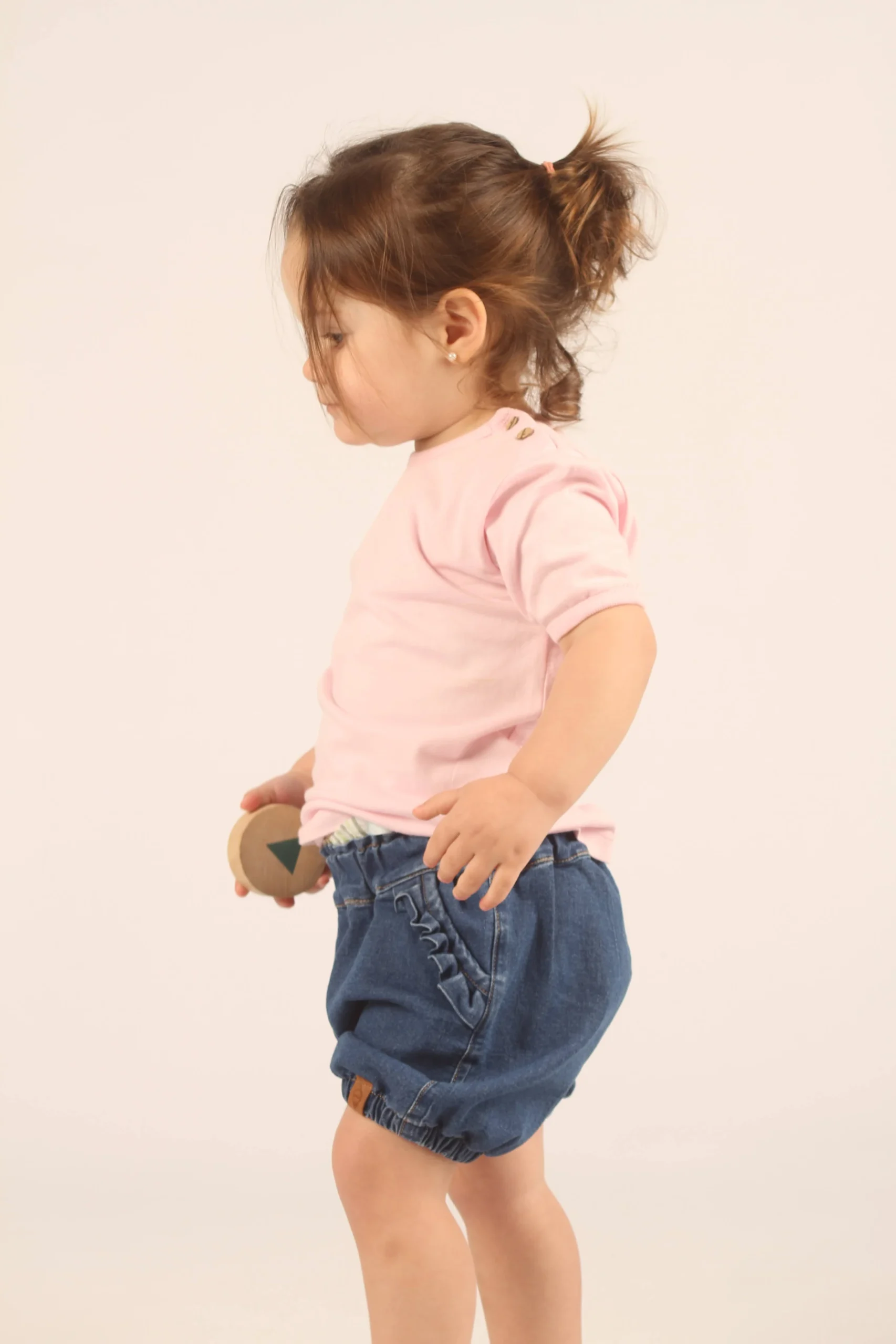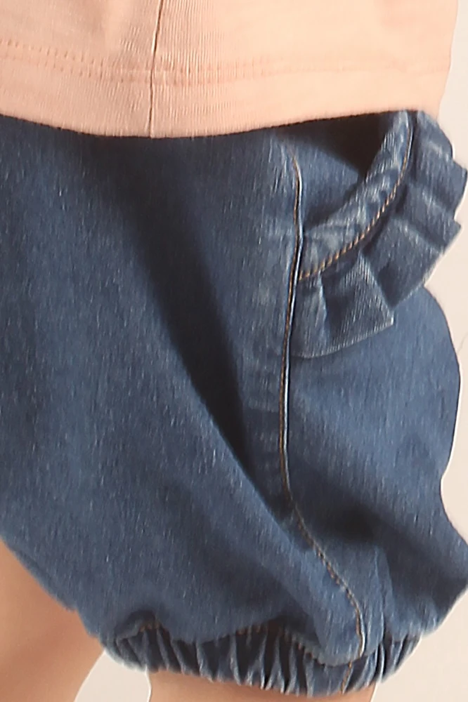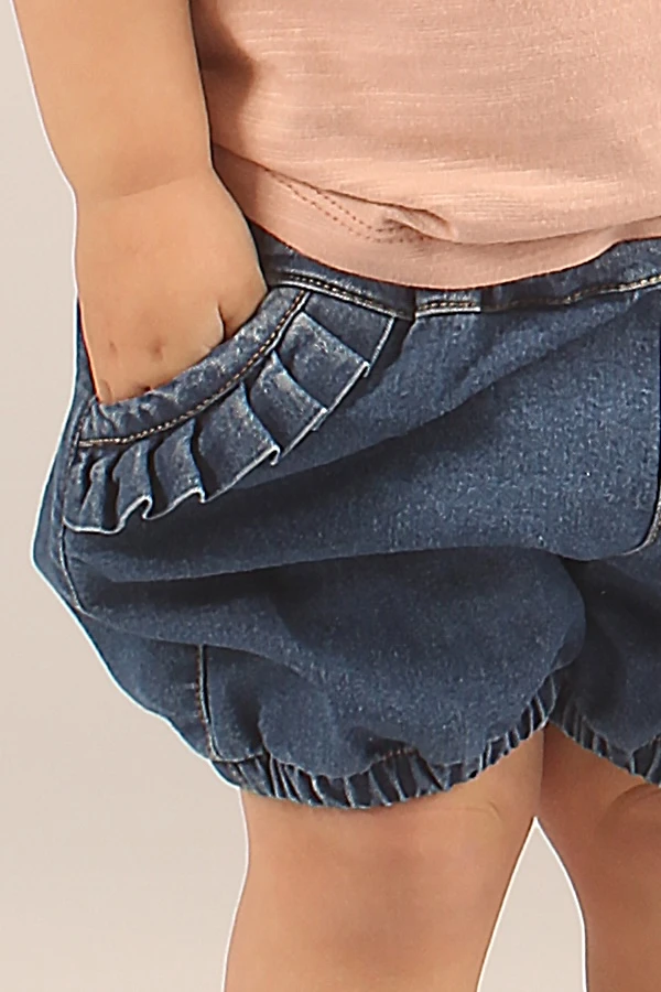 Este short de denim elastizado ofrece comodidad con piernas y cintura elastizados. Los voladitos en los bolsillos delanteros aportan un toque encantador.