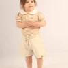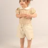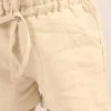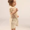 El short Margarita, confeccionado en lino 100% algodón, es ligero y cómodo para los días calurosos. Tiene cintura elastizada y frunce en la cintura para un ajuste perfecto. Los bolsillitos rectos simulados y el cordón decorativo añaden un diseño divertido, mientras que el cuerito Enfans ofrece un toque especial.