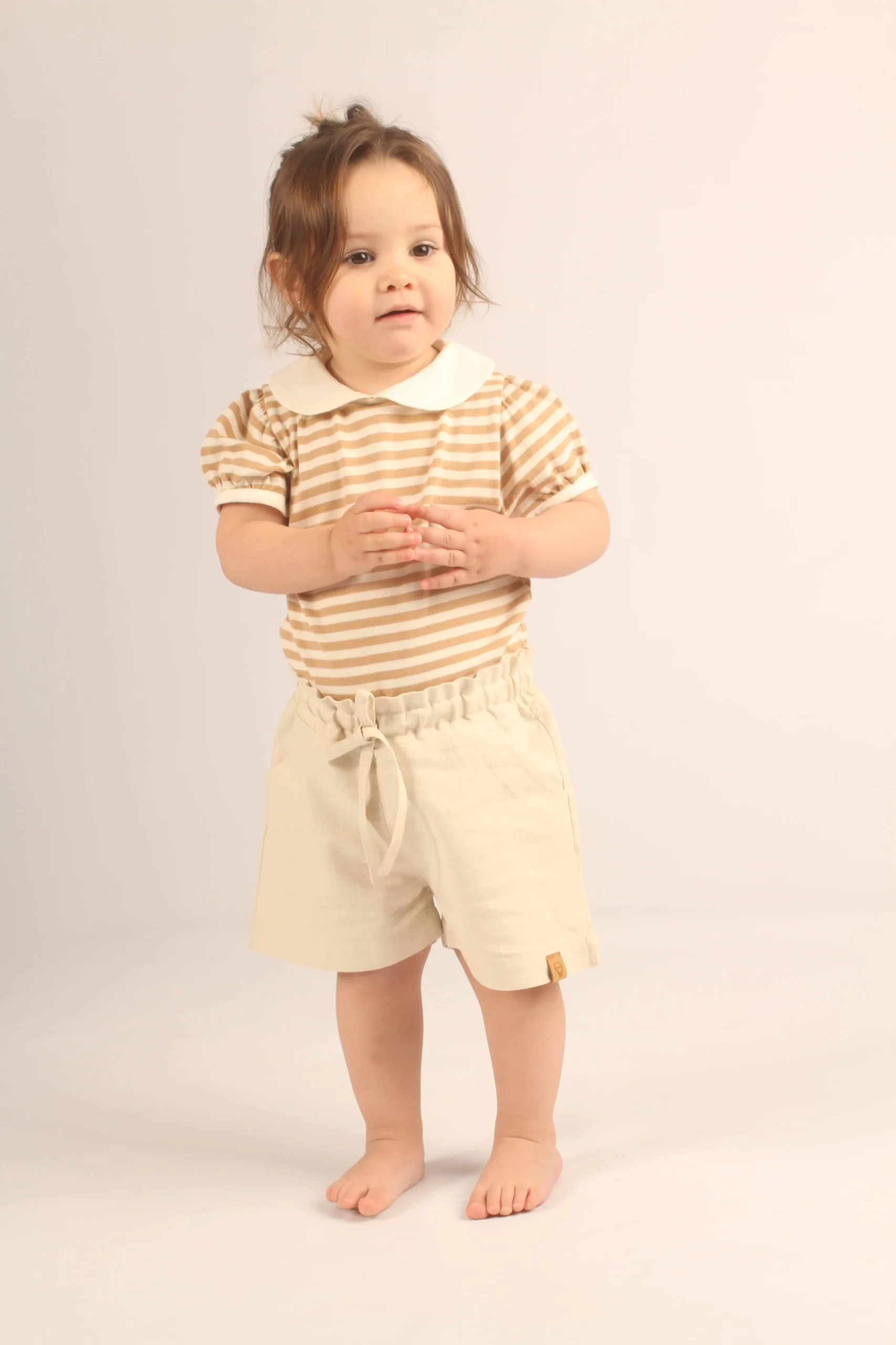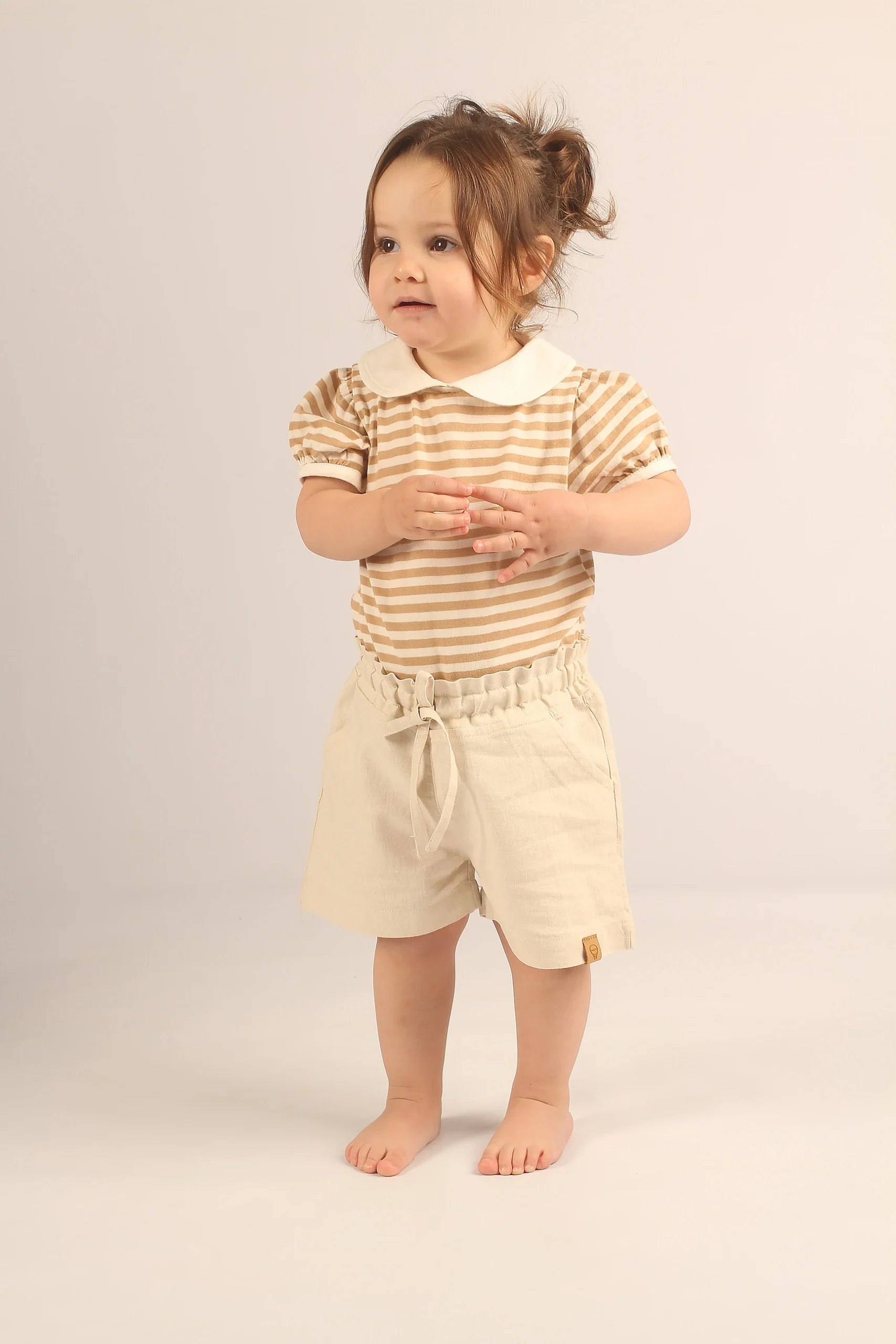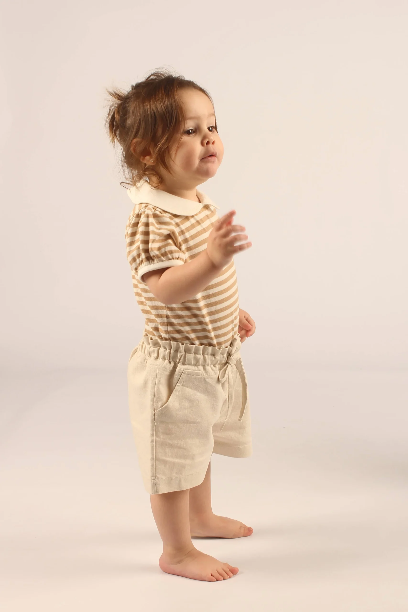 El short Margarita, confeccionado en lino 100% algodón, es ligero y cómodo para los días calurosos. Tiene cintura elastizada y frunce en la cintura para un ajuste perfecto. Los bolsillitos rectos simulados y el cordón decorativo añaden un diseño divertido, mientras que el cuerito Enfans ofrece un toque especial.