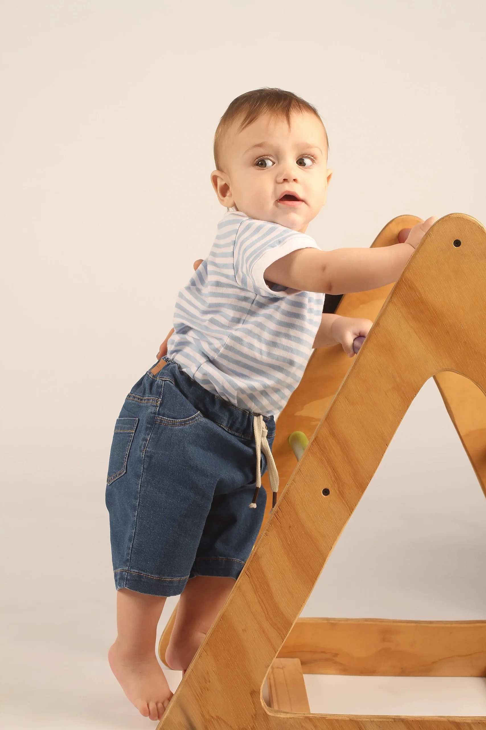 El short Olaf, en denim elastizado, es práctico y cómodo, ideal para los días de verano. Tiene bolsillitos traseros tradicionales y bolsillitos redondos simulados en el delantero. El ajuste con cordón y terminal de metal asegura que se mantenga en su lugar durante las actividades diarias, mientras que su composición de 98% algodón y 2% elastano ofrece flexibilidad y comodidad.