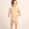 El body Martu, hecho en jersey 24/1 de algodón 100%, se destaca por su suavidad y facilidad de uso. La cartera en el hombro con botoncitos de coco y los broches en la entrepierna hacen que cambiar pañales sea rápido y cómodo. Cuello y mangas entubados en ribb aseguran un ajuste delicado y confortable.