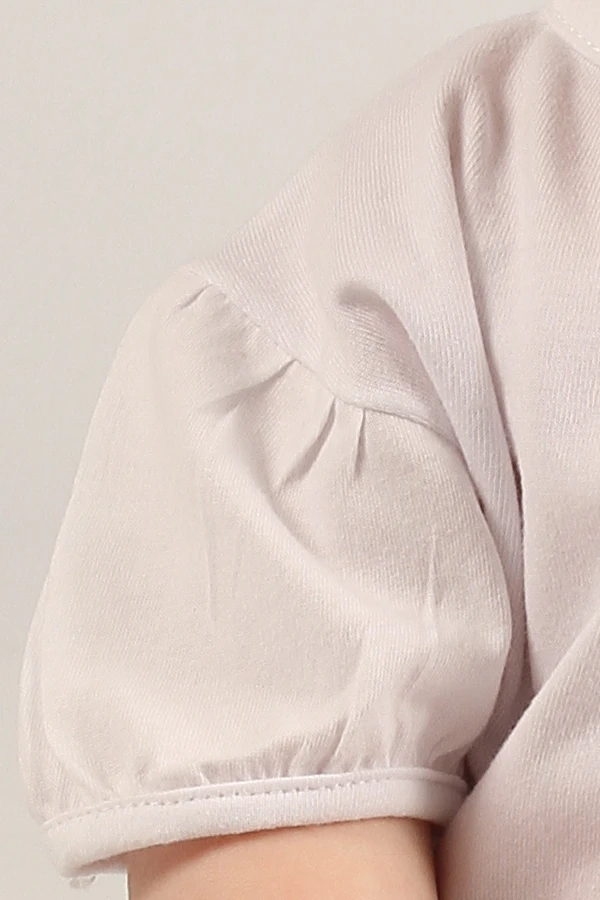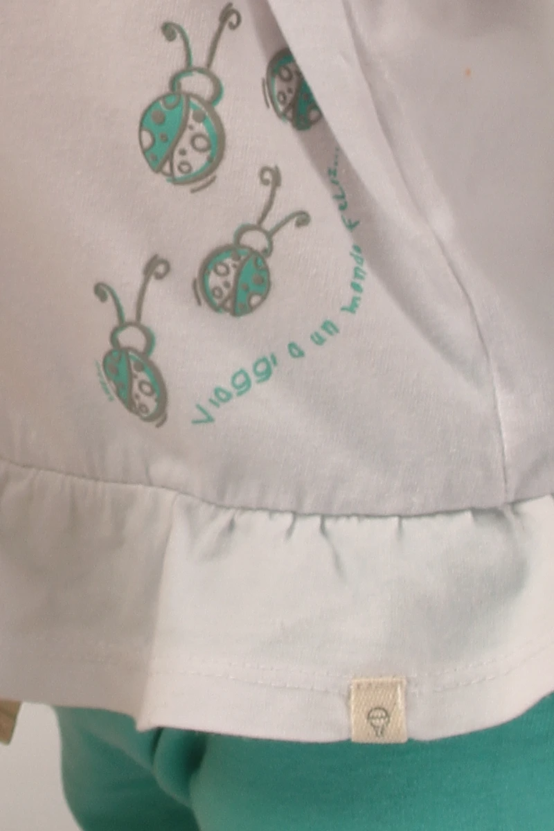 Remera suelta de algodón, con volado en la cintura y mangas princesa, junto con una cartera tipo gota en la espalda y una estampa exclusiva en la parte frontal