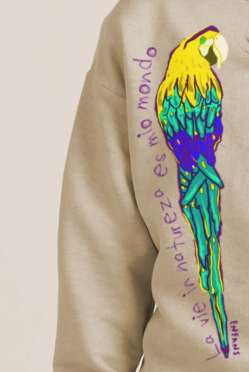 Este buzo es cómodo y sencillo. Está hecho de algodón rústico. Tiene cuello redondo, puños y cintura de ribb a juego. Además, presenta una estampa lateral exclusiva que le da un toque de estilo único.