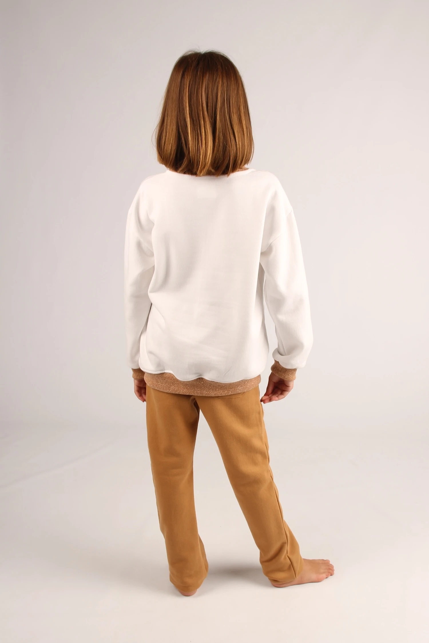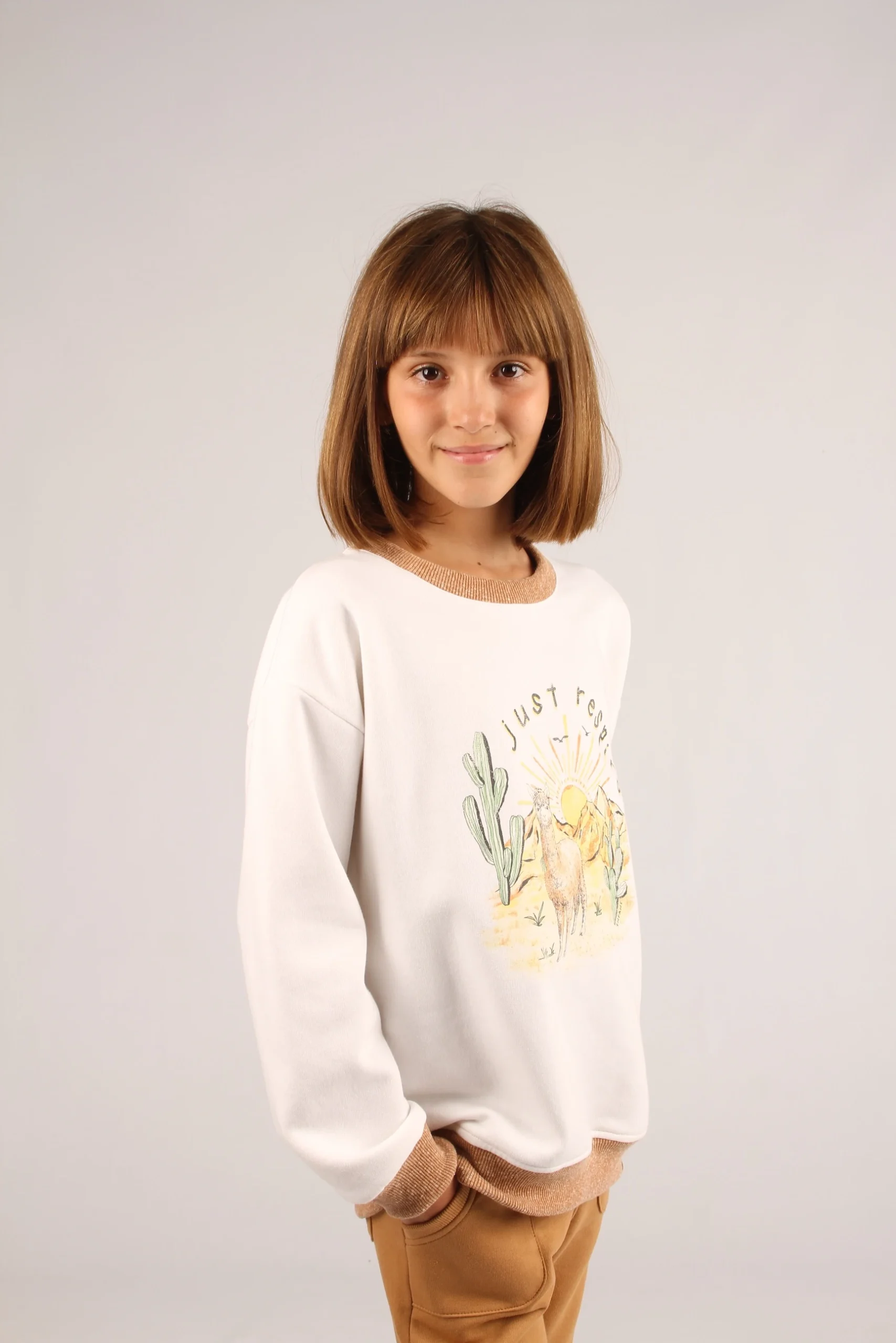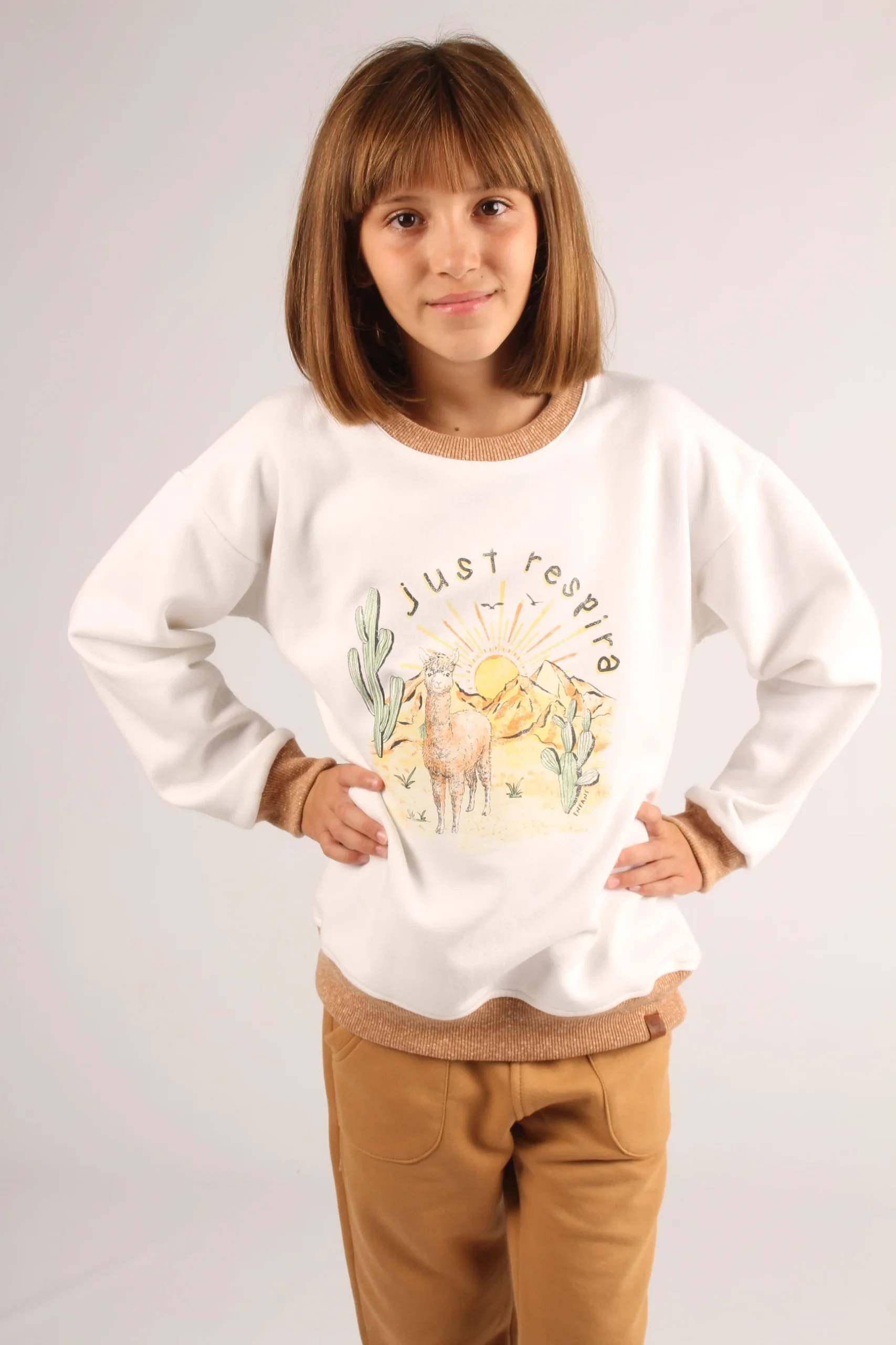 Buzo de algodón frizado con cuello, puños y cintura en ribb a contra tono. Presenta una estampa central exclusiva y cuenta con cuerito Enfans.