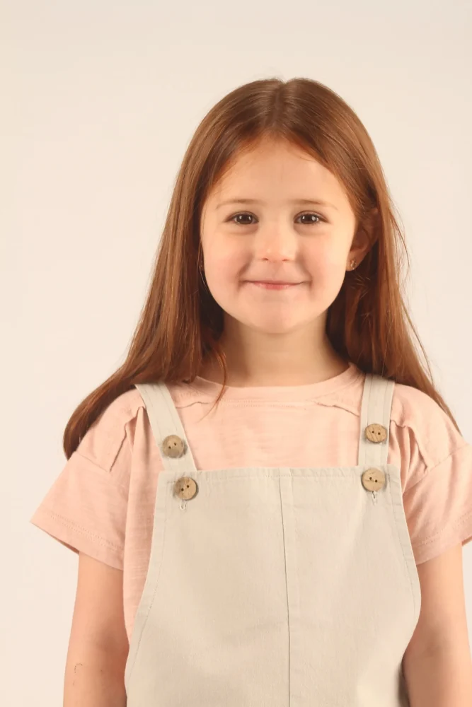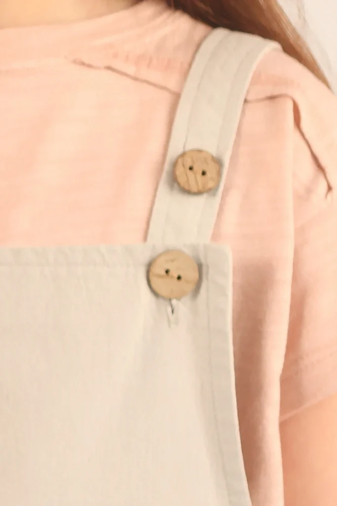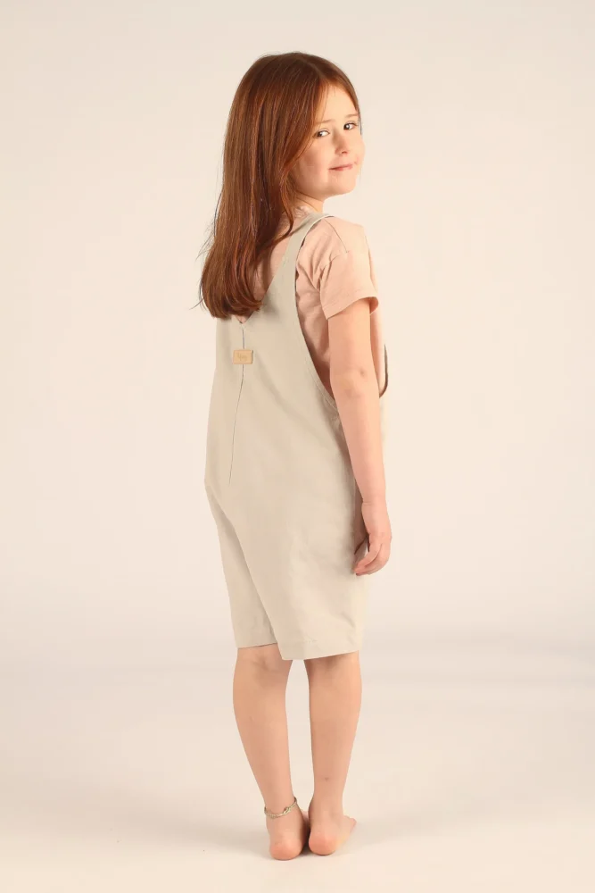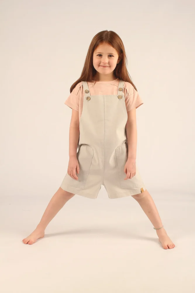 El enterito Inés, de tusor 100% algodón con teñido natural, tiene tiras regulables, grandes bolsillos plaqué y sisa cavada, ideal para usar con una remera. Perfecto para días de juego.