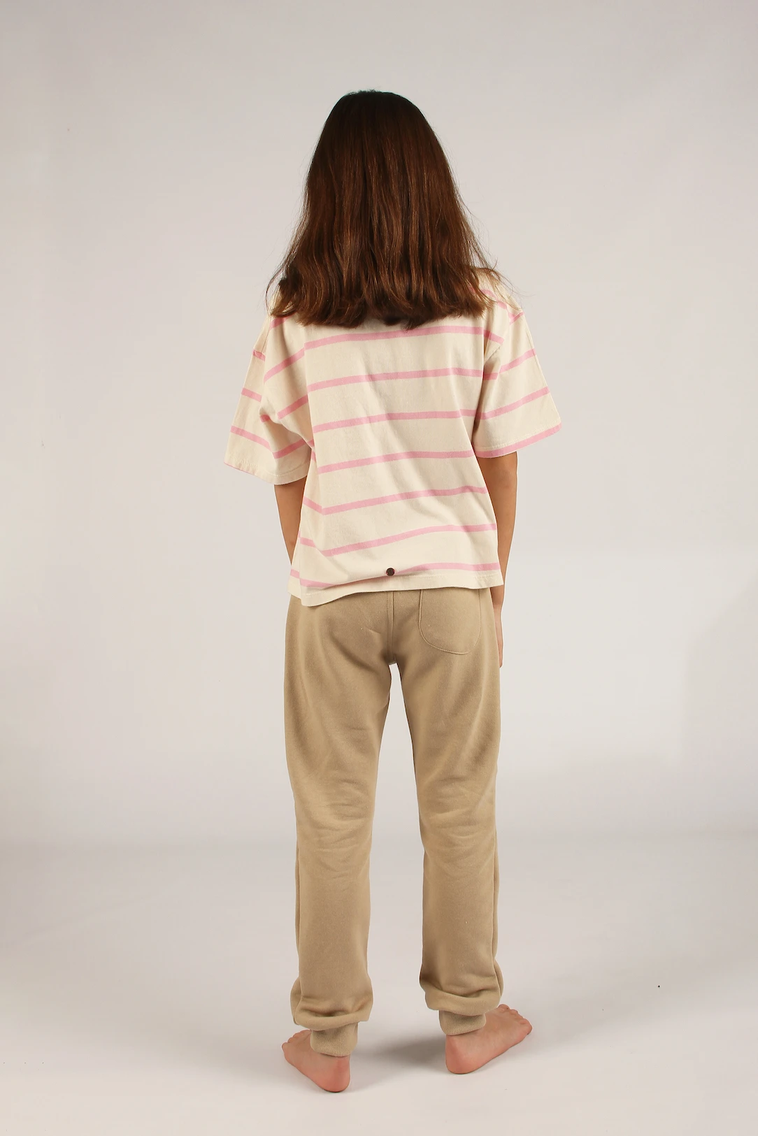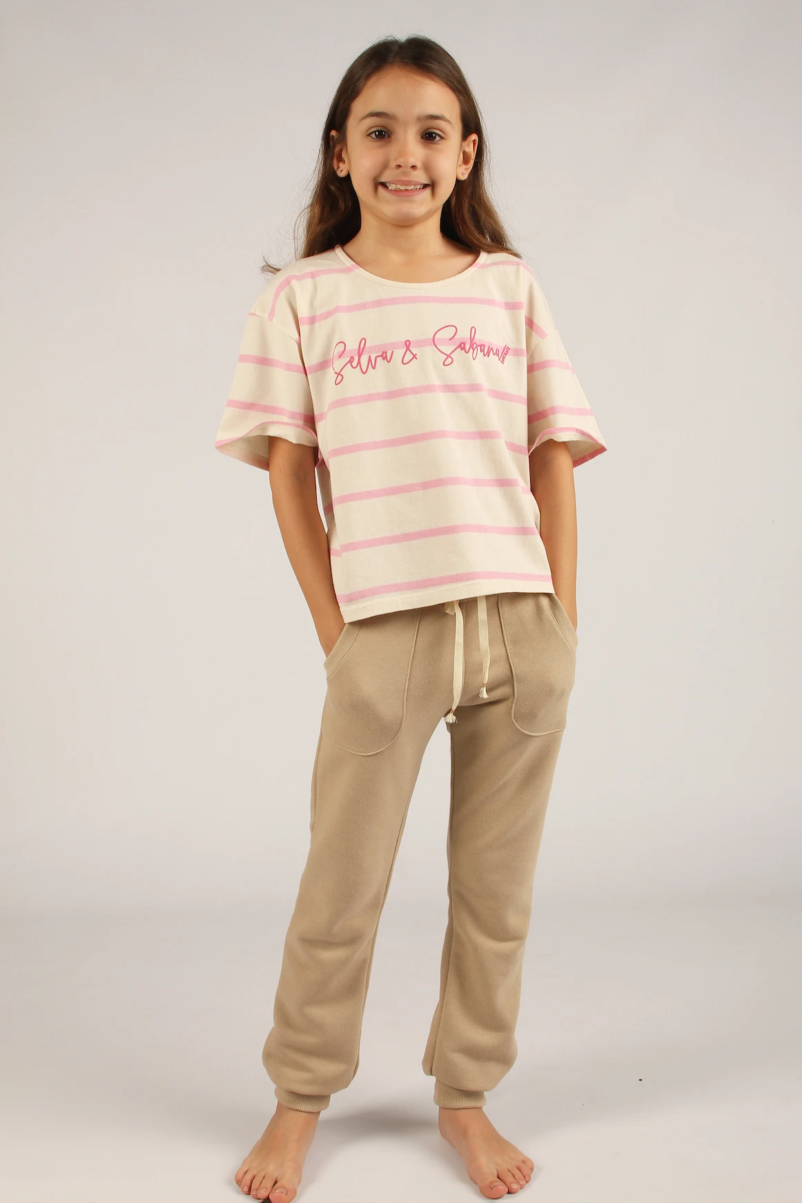 Este jogging de algodón rústico es un equilibrio perfecto entre comodidad y estilo. La cintura y los puños elásticos, con morley a juego, garantizan un ajuste cómodo. Los bolsillos delanteros, también tienen detalle en morley, añaden un atractivo funcional. En la parte trasera, encontrarás un bolsillo tradicional. El detalle especial es la cinta lurex en el centro de la cintura, que aporta un toque de brillo sutil. Además, la prenda tiene una estampa exclusiva en el bolsillo izquierdo y el logotipo de la marca en la parte trasera, lo que la hace única.