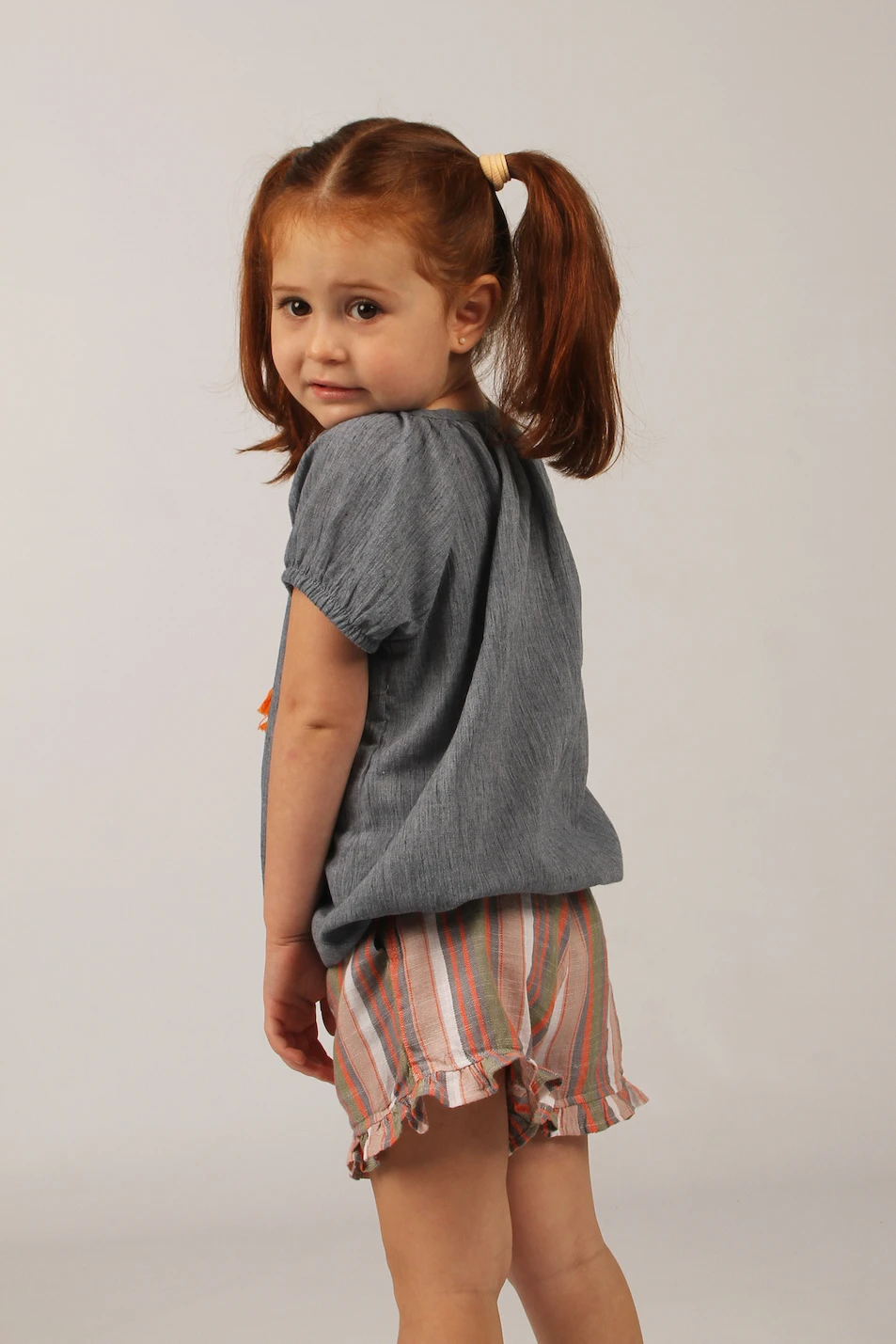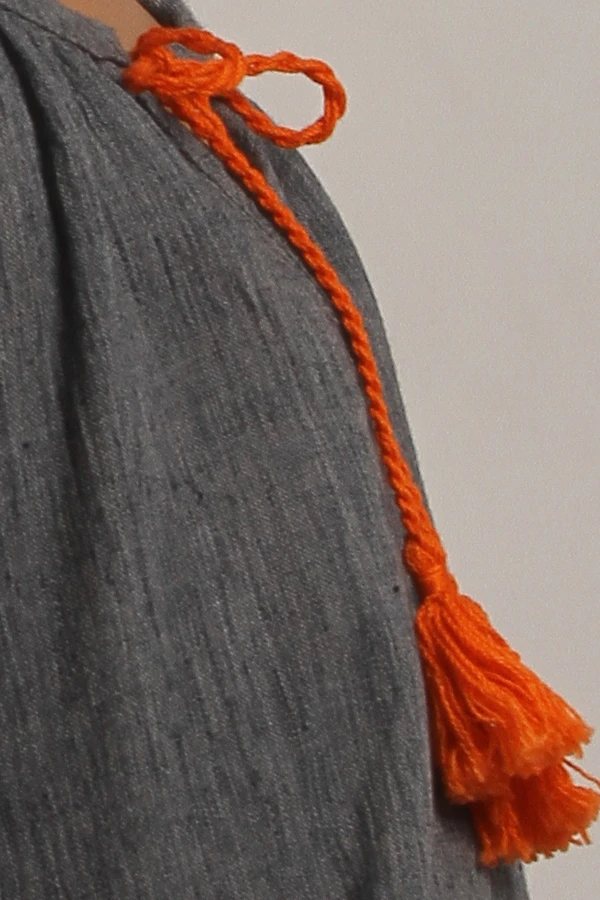 Esta blusa de lino es cómoda y fresca. Tiene mangas y cintura elásticas con un efecto fruncido que crea un aspecto abullonado. El cuello tiene una forma de gota y un cordón con una borla como detalle adicional.