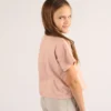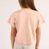 La remera Jade, confeccionada en tela flamme jersey, presenta un delicado detalle en los hombros donde la tela se une con un borde al corte, añadiendo un toque distintivo al diseño.