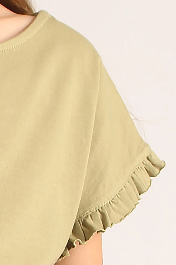 La remera Luz, confeccionada en algodón 100%, es una prenda básica con un toque especial. Sus mangas caídas con voladitos en la terminación y el cuello bote pisado le añaden un estilo delicado y cómodo.
