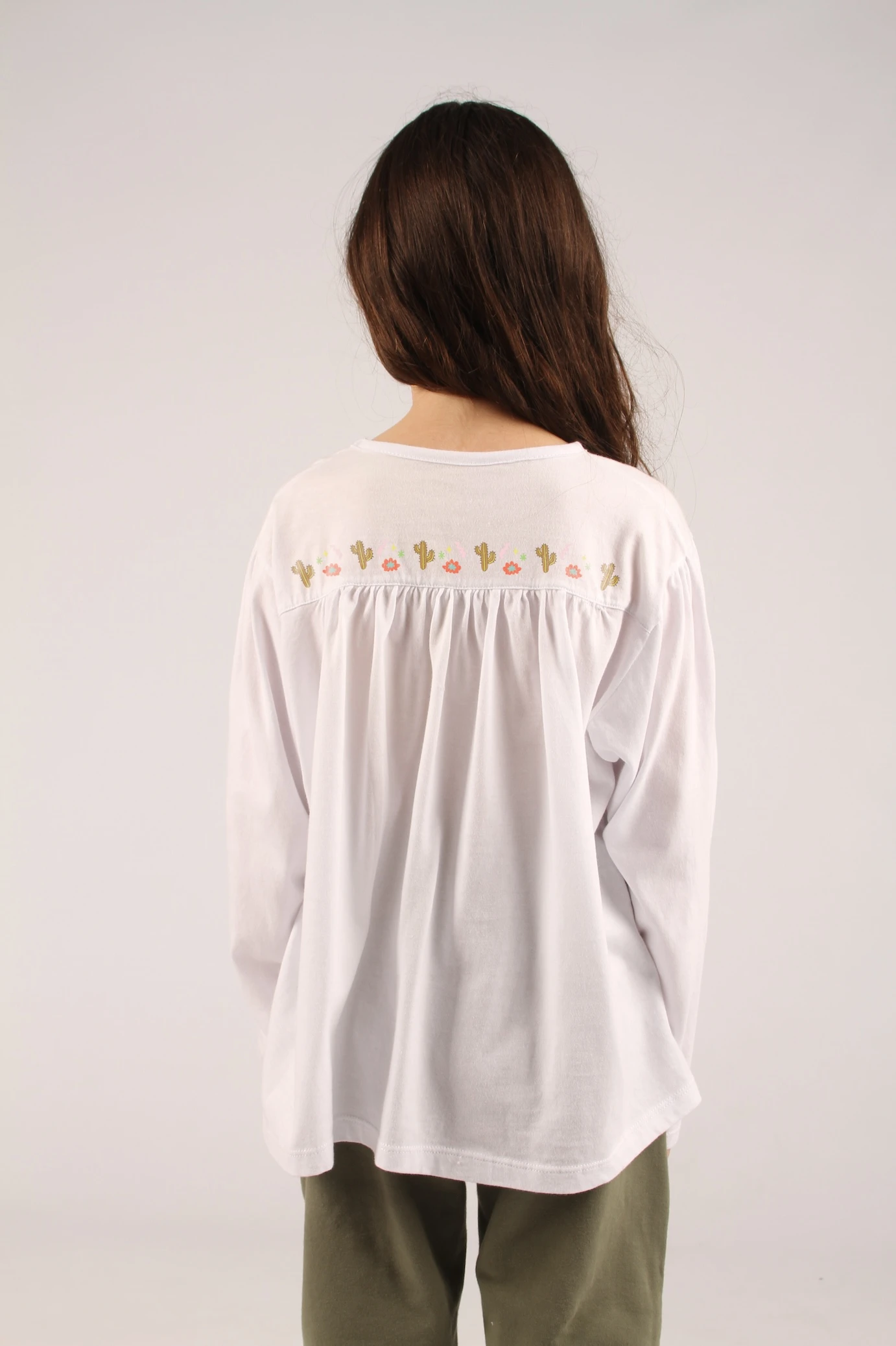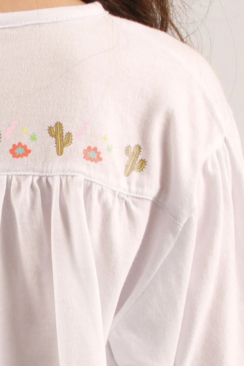Esta remera de algodón 100%, tiene estampado en el frente y la parte traera, cuello entubado y detalles de hombros fruncidos estilo princesa. Además, presenta un frunce en la espalda dándole un toque especial