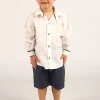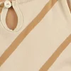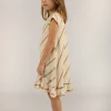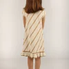Este vestido, confeccionado completamente en algodón, es una prenda fresca y cómoda. Las rayas diagonales le otorgan un toque de estilo. El cuello tipo gota con pespunteado se cierra con un botón de nácar, agregando un detalle encantador. Además, tiene un volado en el ruedo que le aporta un toque de diseño.