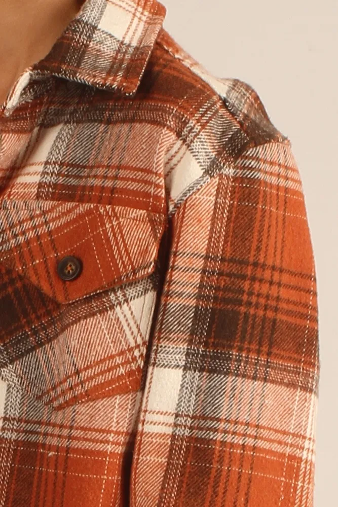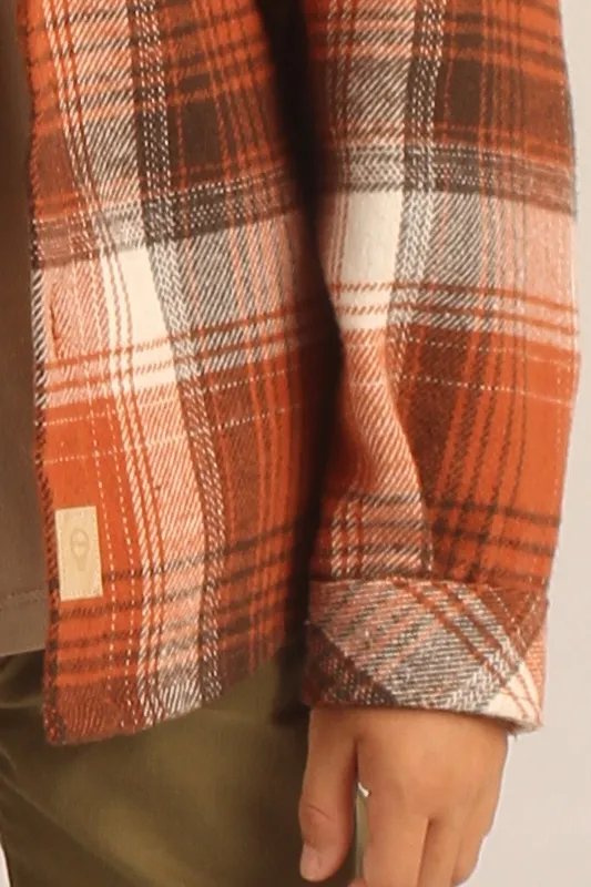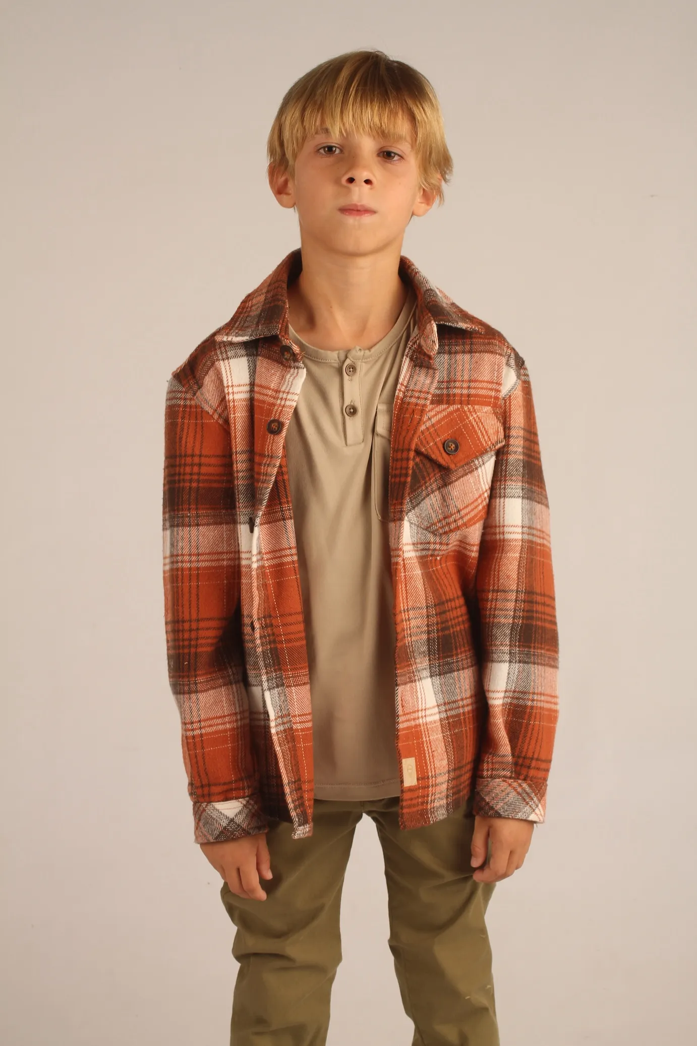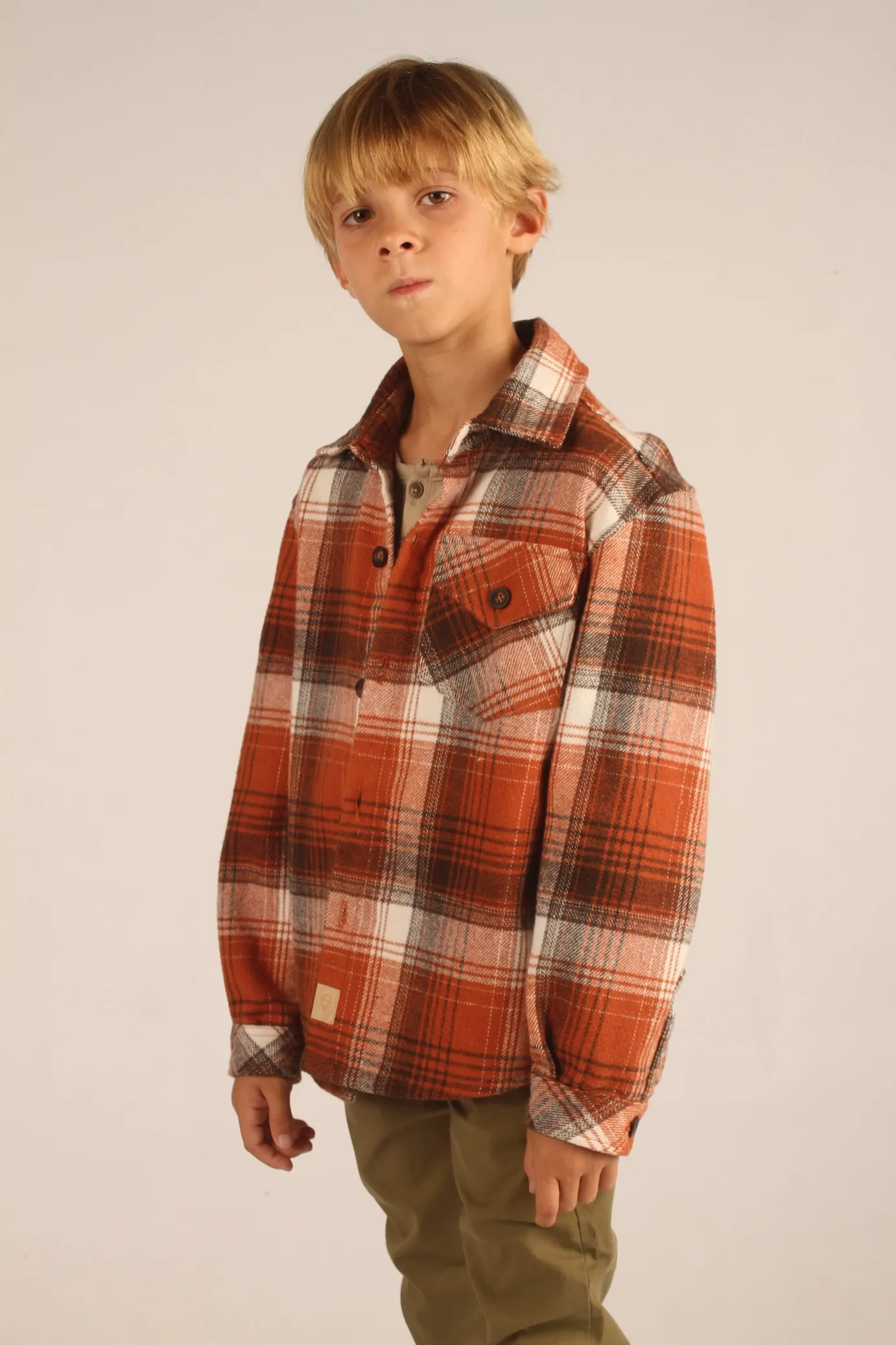 Camisaco de paño escocés con bolsillo delantero tipo plaqué y detalle de cuerito Enfans. Los puños con botón aportan un toque práctico, ideal para mantener a los niños cómodos y abrigados.