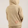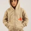 Esta campera de rústico de algodón es una prenda cómoda y versátil. Tiene un cierre central que combina con el tono de la prenda. La cintura y los puños están hechos de ribb para un ajuste cómodo. La capucha está forrada en jersey, lo que la hace aún más acogedora. En la parte delantera, presenta una estampa exclusiva en posición de logo, y en la espalda, una estampa adicional. Los bolsillos son tipo canguro y están dispuestos en diagonal, con un detalle al corte que agrega estilo. También cuenta con una etiqueta identificatoria.