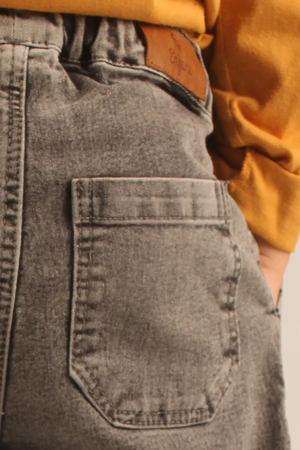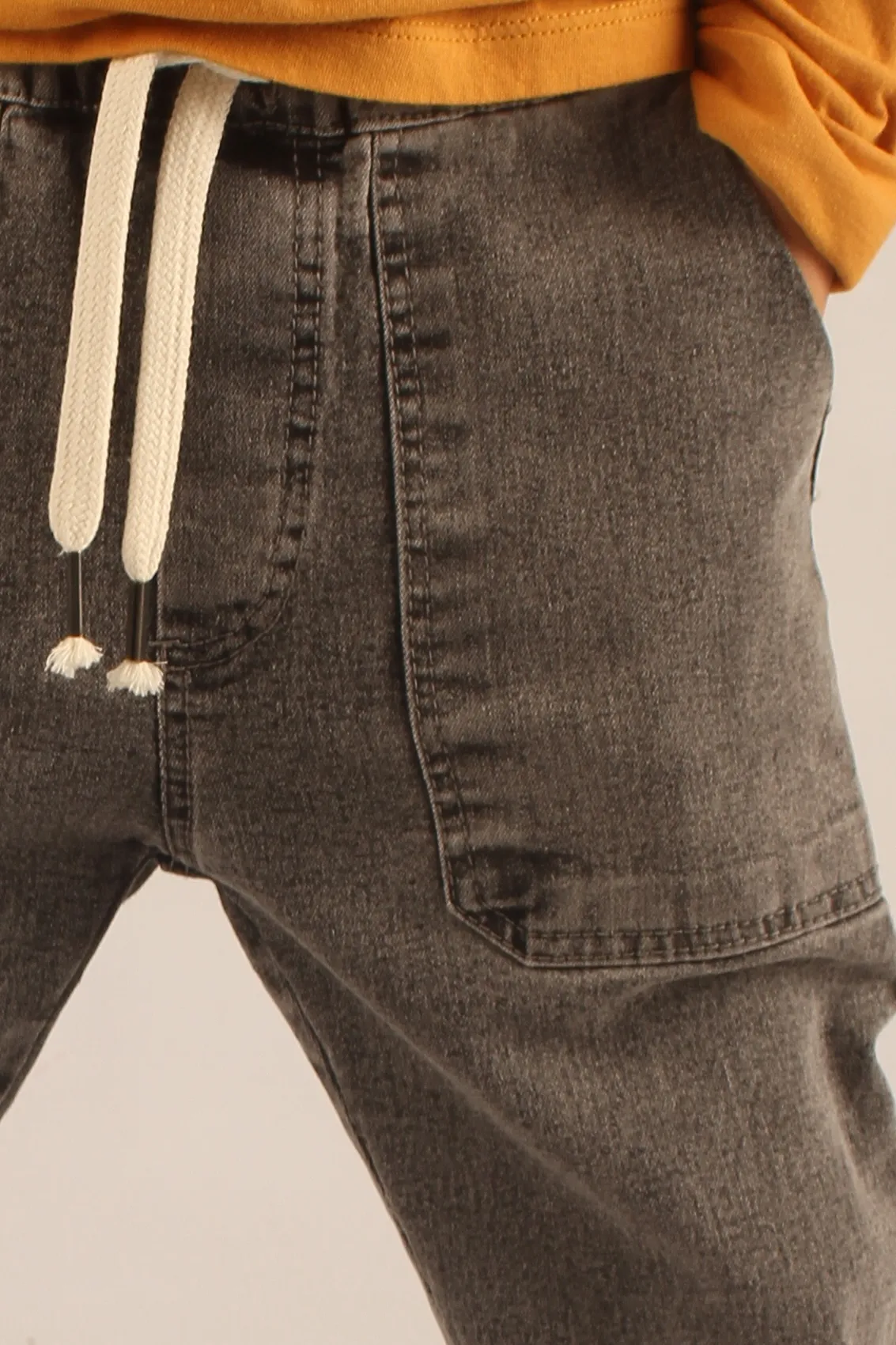 Pantalón de denim elastizado con bolsillos delanteros tipo parche y apertura diagonal, aportando un diseño práctico y cómodo. La cintura elastizada con cordón ajustable y terminales de metal asegura un ajuste perfecto. Además, cuenta con un bolsillo plaqué trasero que completa el estilo funcional de la prenda.